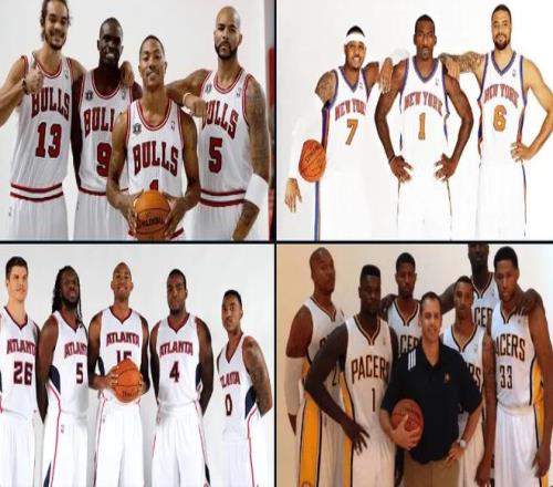 这张图的四大强队有:罗斯的超60胜公牛,安东尼、斯塔德迈尔、钱德勒三巨头尼克斯,跟勇士争夺常规赛冠军且有四大全明星的老鹰,以及乔治、格兰特、史蒂芬森、韦斯特和“高圆圆”的东决步行者。