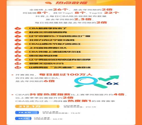 CBA联赛官方内容平台抖音首周战报来啦!从12月12日CBA揭幕战开始,抖音全程播出了过去一周的27场常规赛,累计观看人次4.36亿,累计观看人数8502万。CBA首周短视频总播放量超8亿,抖音全国榜热点26个。在抖音沉浸式看CBA!赛事球星热点内容一网打尽,更有超多大咖达人陪你看球,看比赛,“购”精彩!