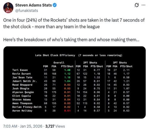 根据火箭媒体Steven Adams Stats统计,开赛至今火箭队在24秒进攻前17秒出手的占比仅为76%联盟倒数第一,后7秒占比高达24%联盟第一。