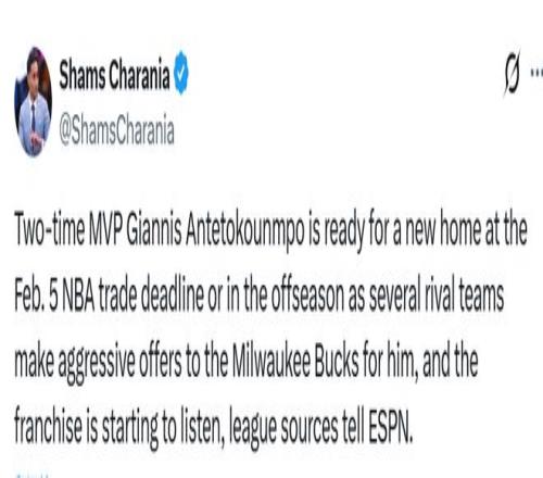 联盟消息人士表示,各队都能明显感觉到,雄鹿在本赛季交易截止日前,对关于字母哥的报价持前所未有的开放态度。不过消息人士同时指出,雄鹿已向有意向的球队明确表态:球队并不急于完成交易,如果无法得到一位极具潜力的新星,以及/或者足够多的选秀权,他们愿意将字母哥的未来问题推迟到休赛期再商讨。等到今年夏天,雄鹿还能进一步观察,哪些球队能拿出更具吸引力的选秀权筹码。